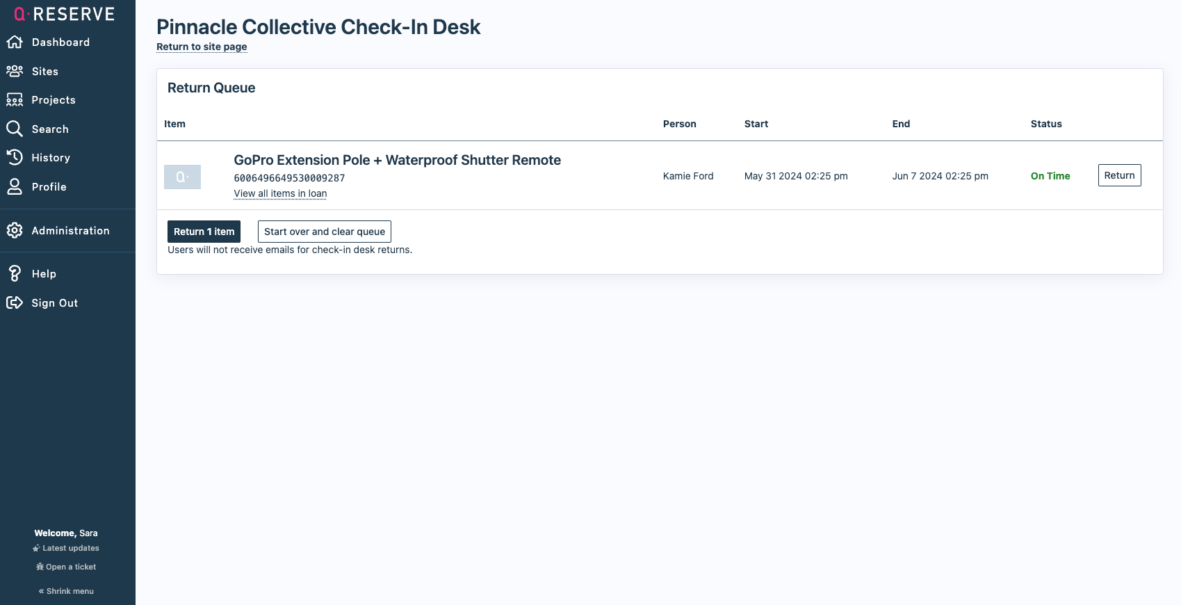 You can also begin the check-out process by scanning the item that is being borrowed (or manually search the item's name) and choose who is borrowing the item. Once the checkout process has begun you can scan more items to add to the reservation.