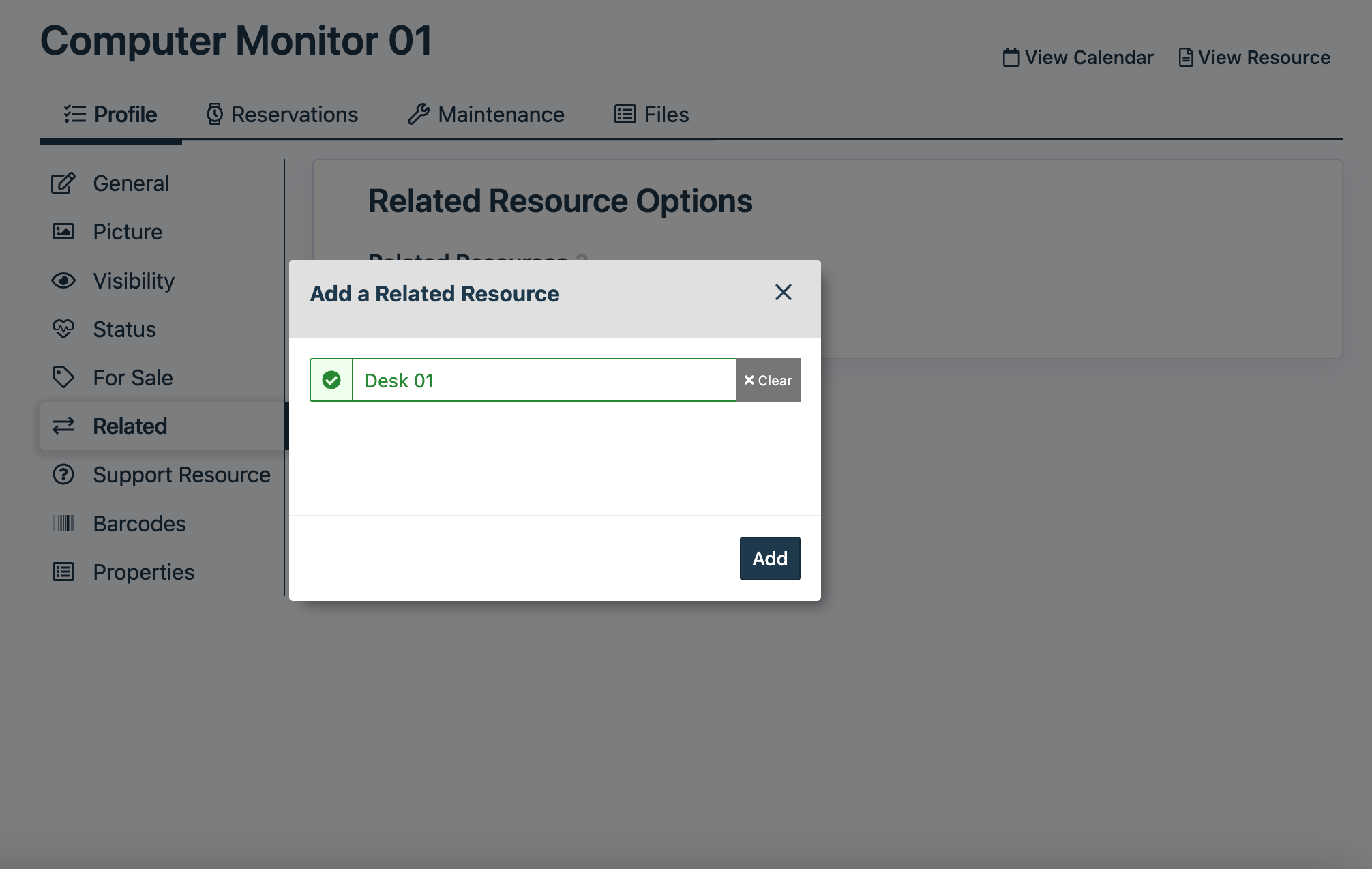 To create related resources go into the selected resource and under Profile / Related and add the resource you would like to create a relationship with. In this case, we are adding Desk 01 as a related resource to Computer Monitor 01. Once the relationship has been created Desk 01 will also show Computer Monitor 01 as a related resource on its resource page.